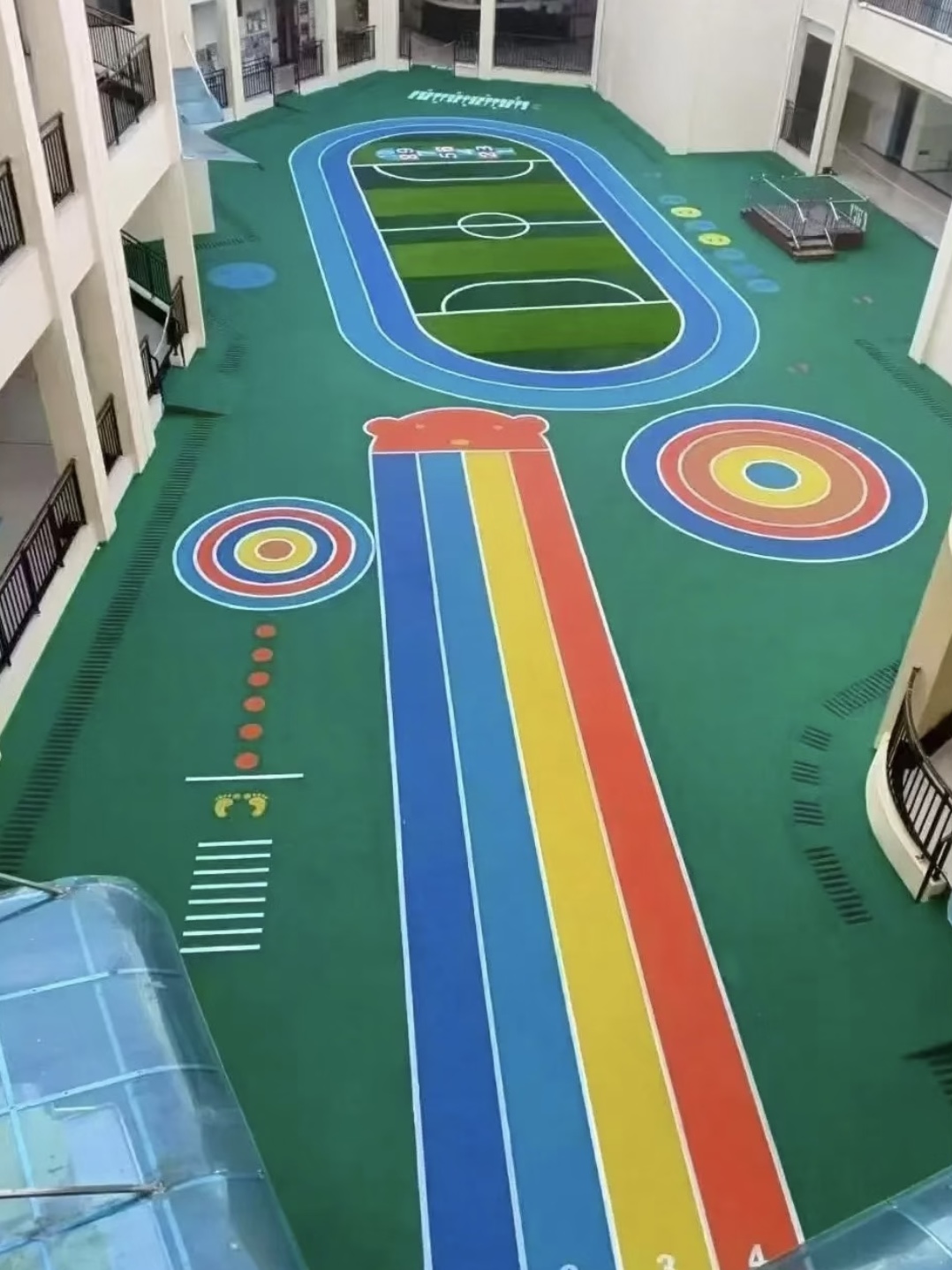 除了安全和环保,我们幼儿园的 EPDM 场地还有一个隐藏的“软实力”,那就是它丰富多彩的颜色。EPDM 材料可以调配出各种鲜艳的色彩,我们根据孩子们的喜好和特点,把场地设计成了一个色彩斑斓的世界。